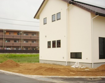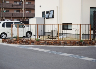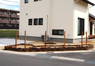 施工前ですアンティークなレンガで花壇を造り、柱を建てて